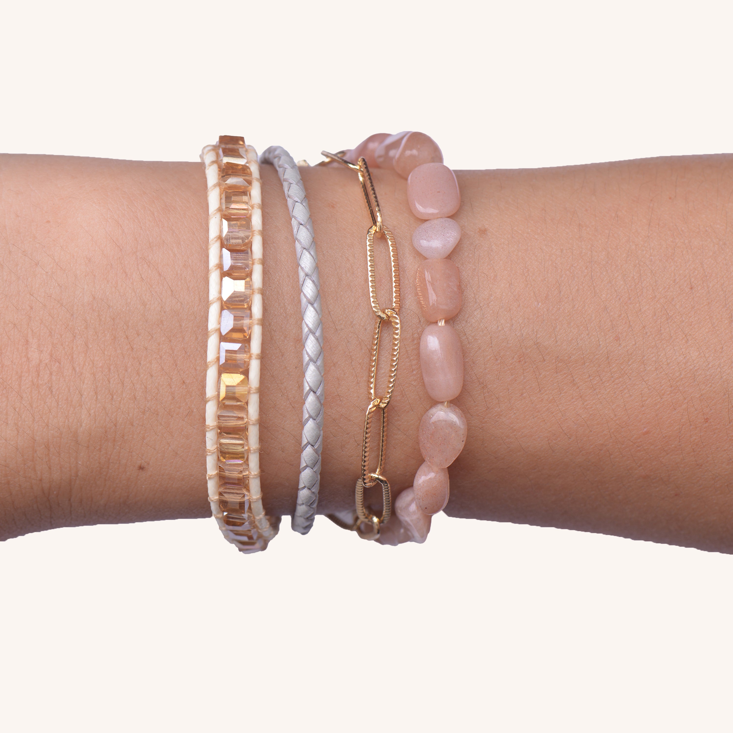 Stacked bracelets but all on one clasp. Trendy ball beads are mixed with genuine crystals and leather to make the perfect pre-layered piece.