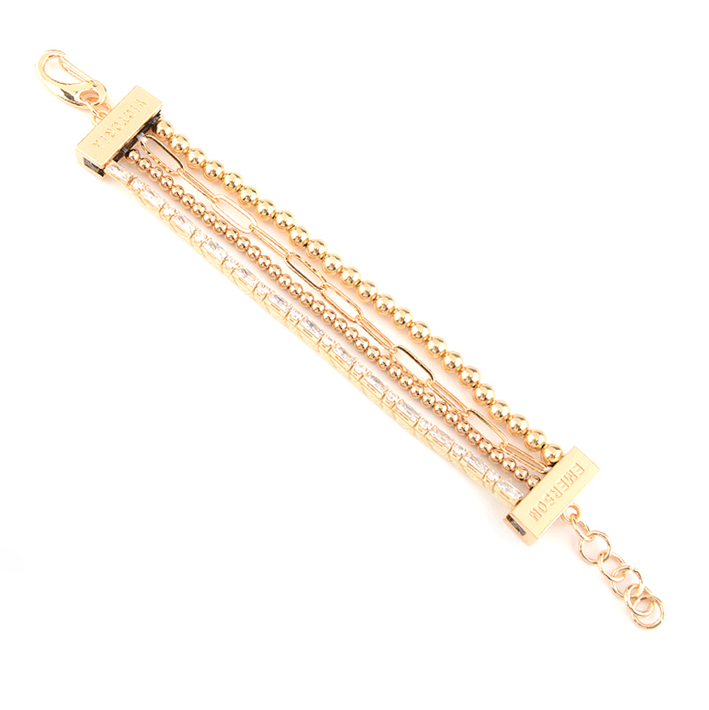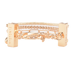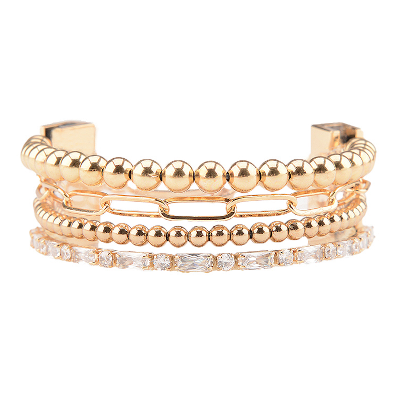 Stacked bracelets but all on one clasp. Trendy ball beads are mixed with tennis bracelet and cuban chains to make the perfect pre-layered piece.