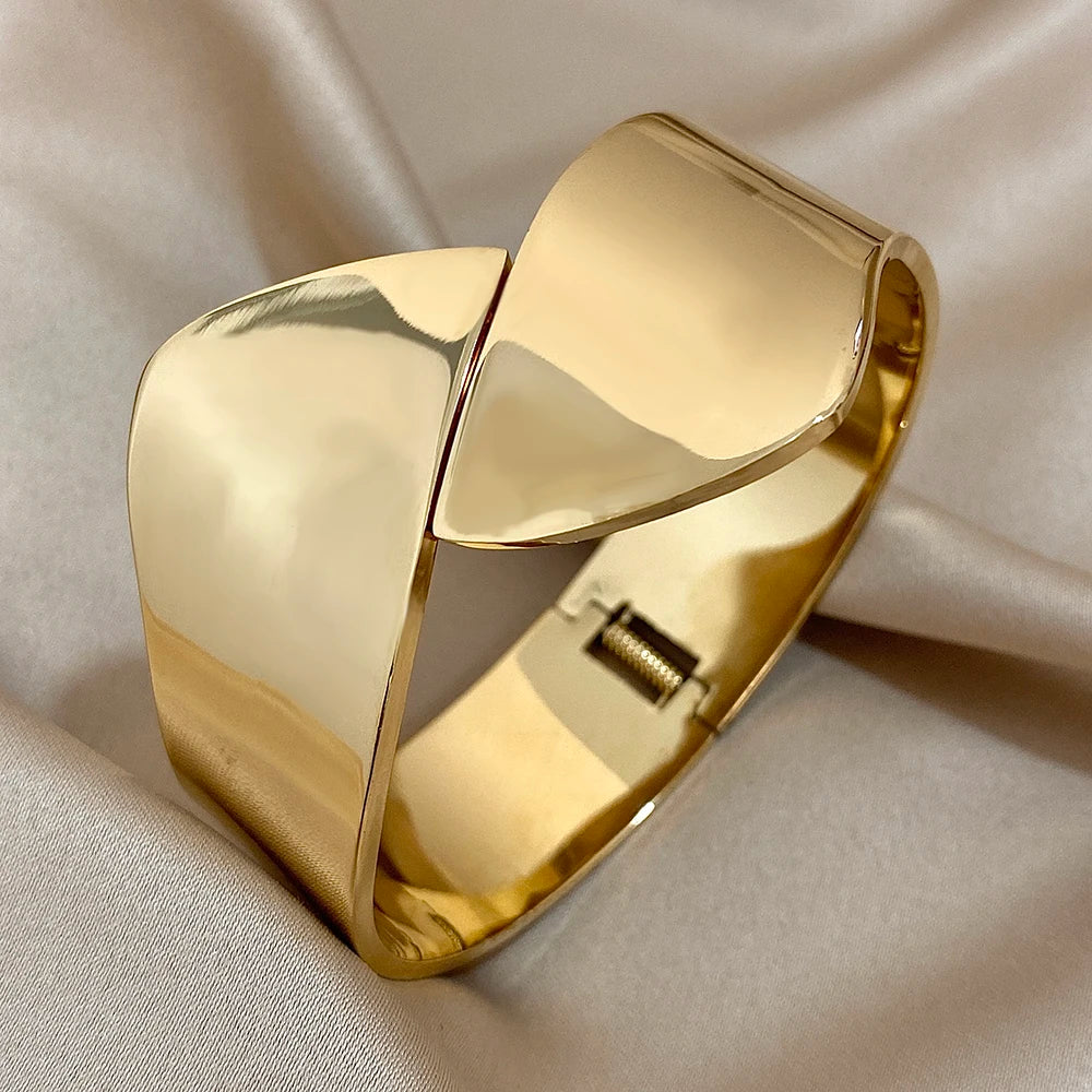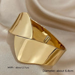 This generously proportioned open cuff makes an immediate impression — the wide, smooth surface catches light beautifully and commands attention without any extra embellishment. Waterproof stainless steel means it's as low-maintenance as it is striking. Wear it with a clean wrist or let it anchor a layered stack.