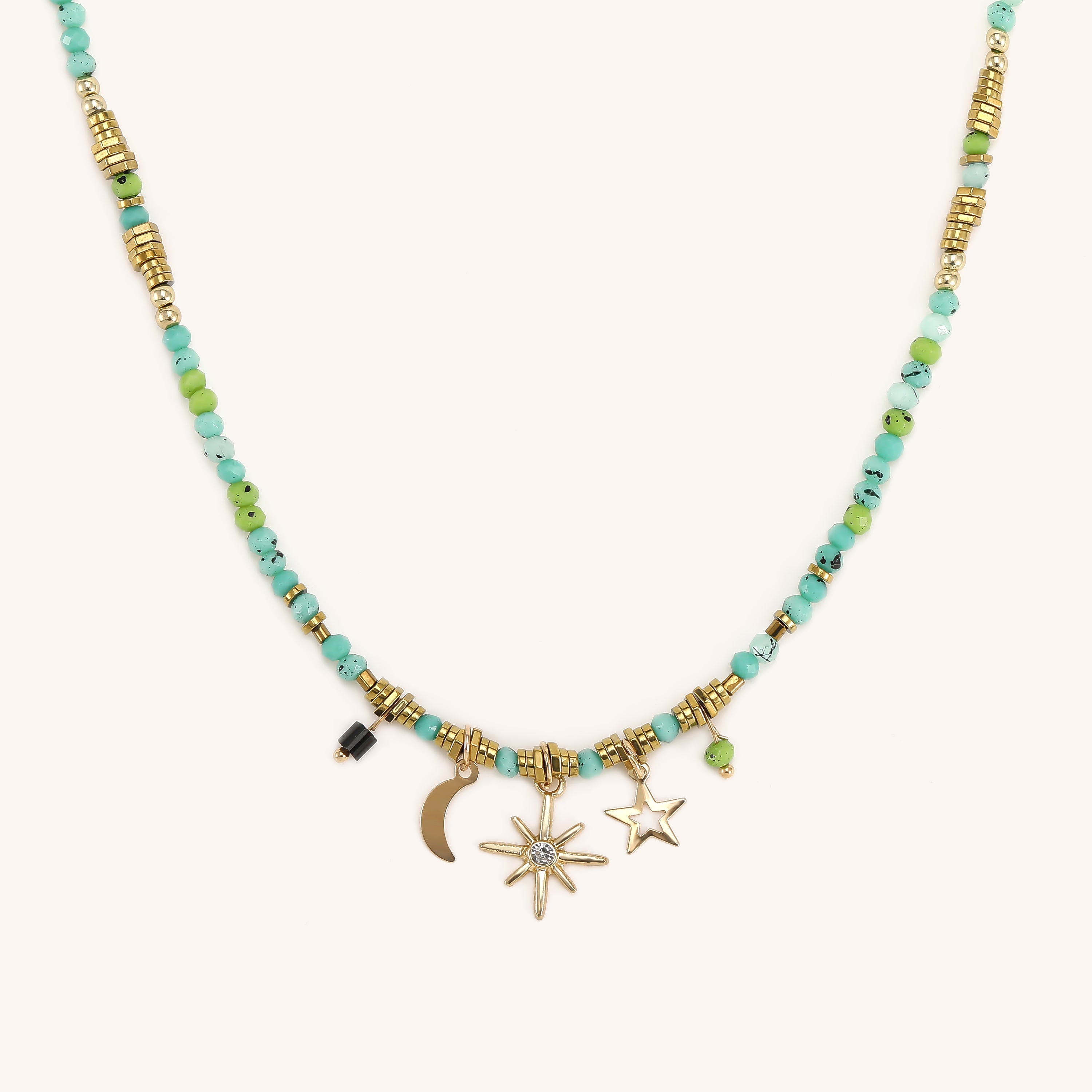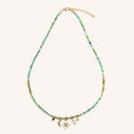 The Colorful Beaded Charm Necklace shines with playful celestial charms and vibrant beads. This cheerful accessory adds a lively burst of color and cosmic charm to any outfit.