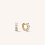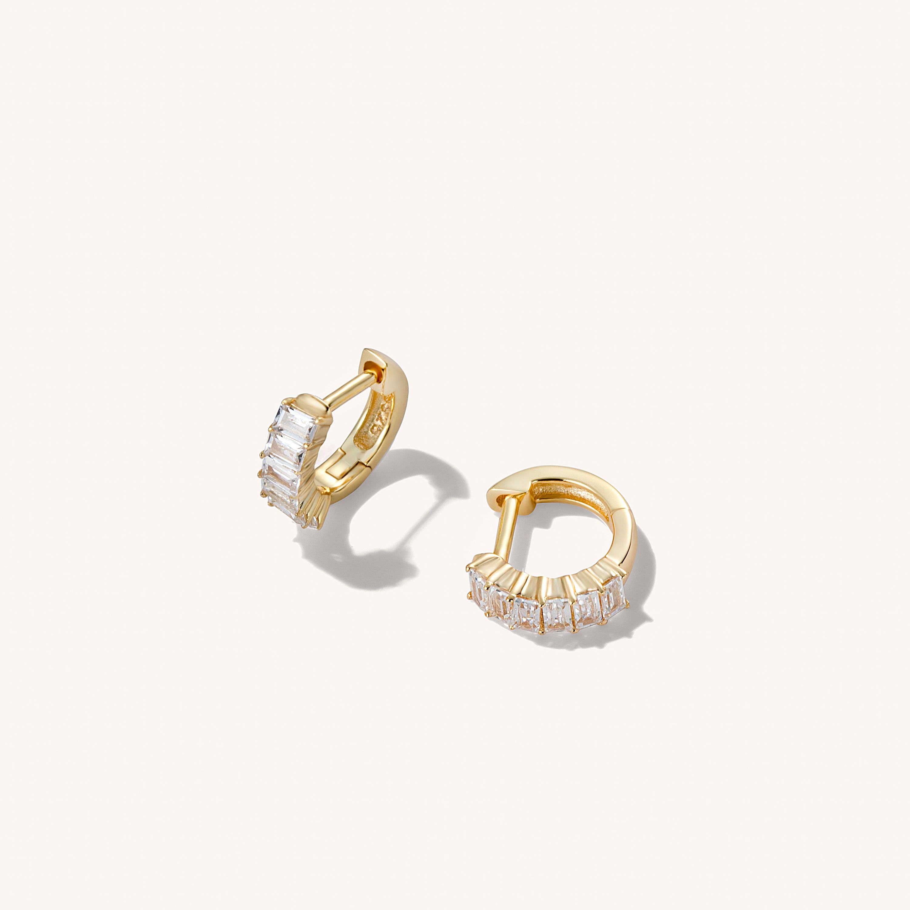 Micro baguette cut crystals are set on the front of this adorably luxe huggie. Finished in our long-lasting 18K Gold vermeil with a solid 925 Sterling silver base, these earrings are made to last.