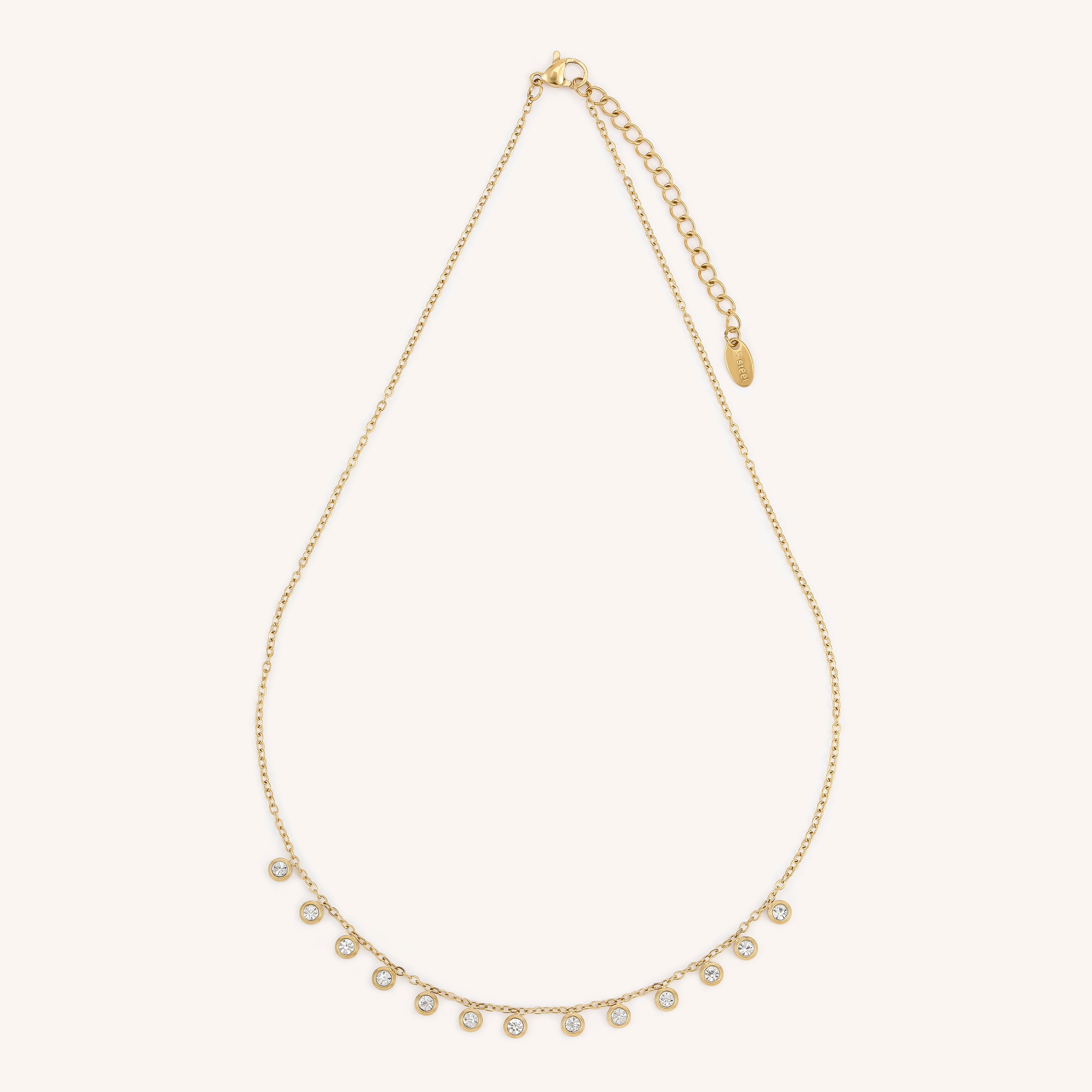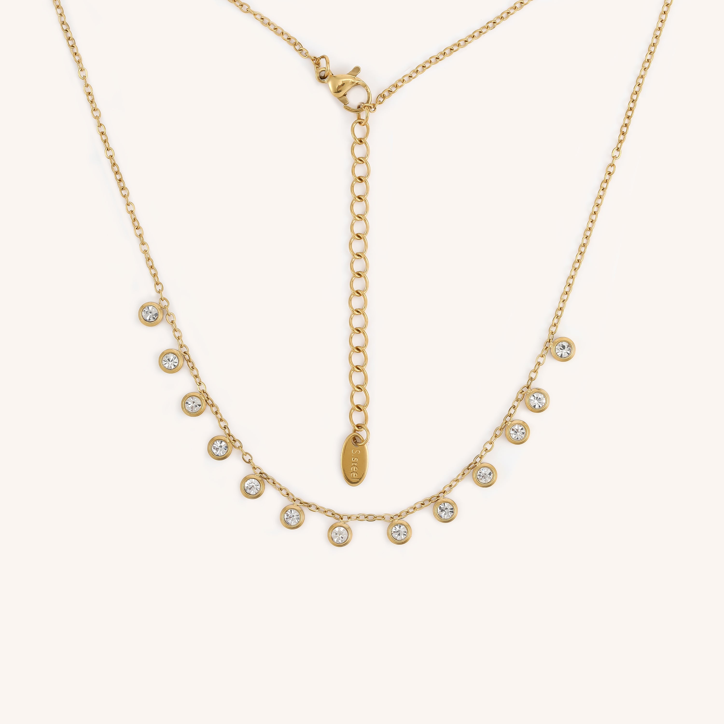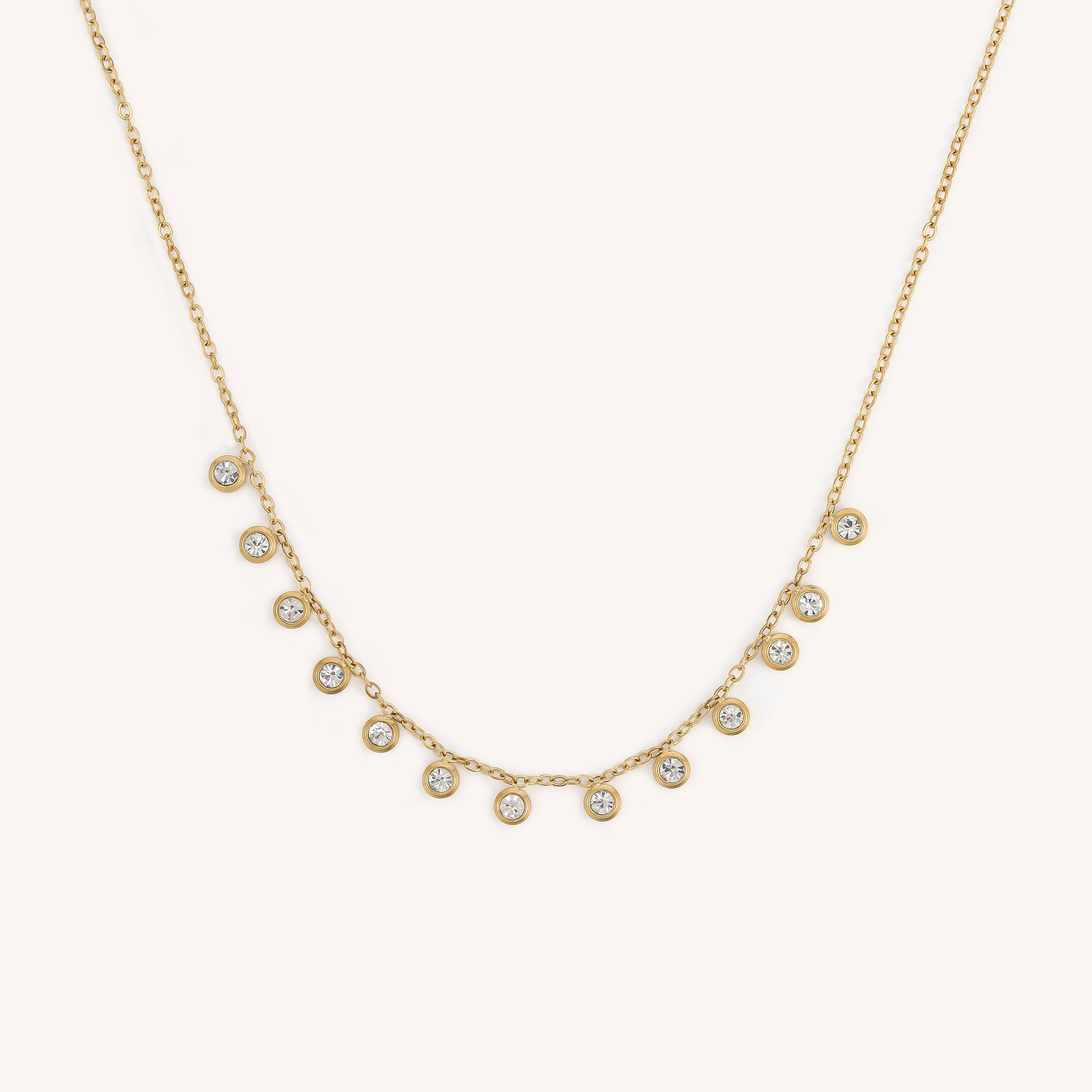 Elevate your everyday elegance with this refined Crystal Drop Necklace. Featuring multiiple luminous crystal pendants suspended from a delicate chain, this piece captures light beautifully while maintaining an understated sophistication.