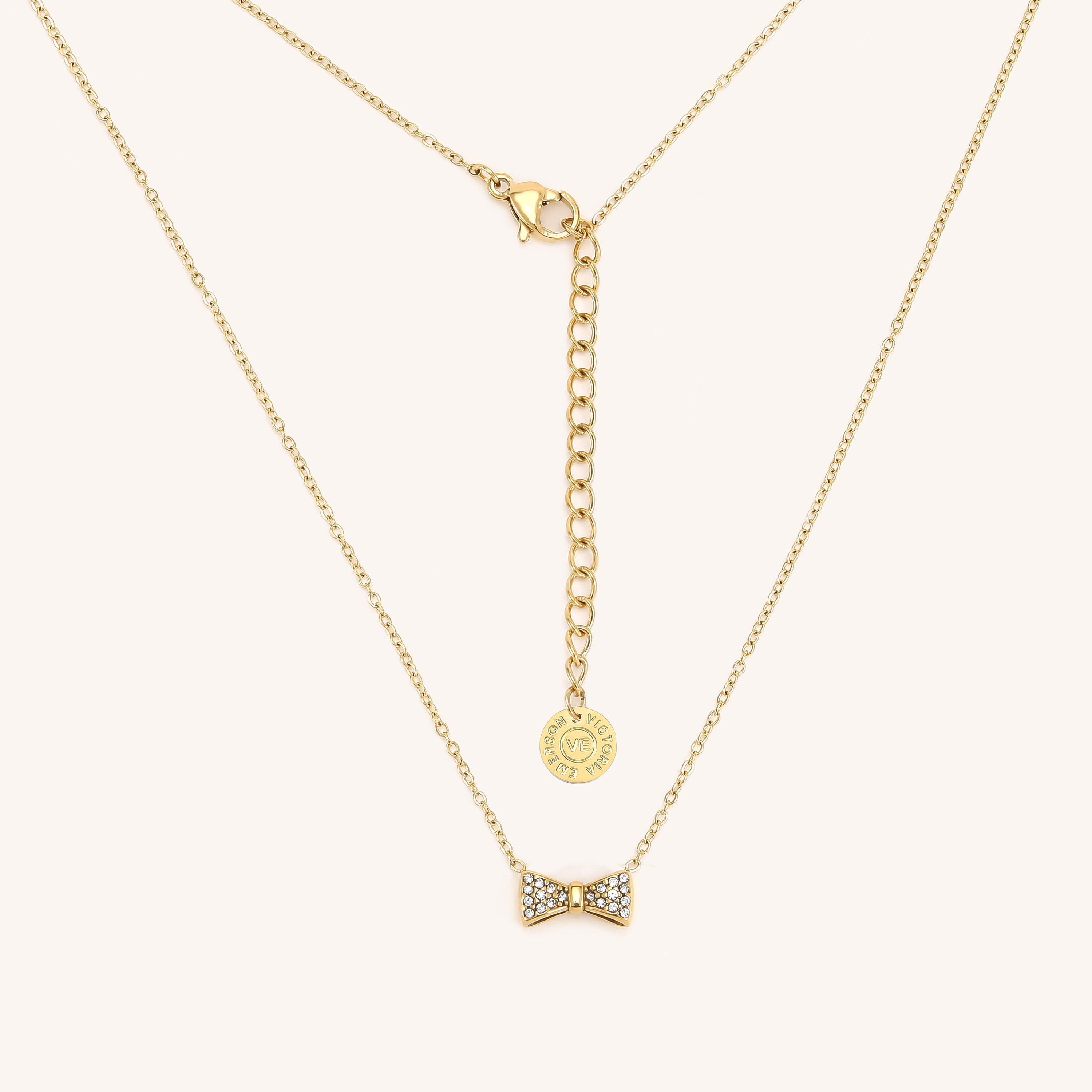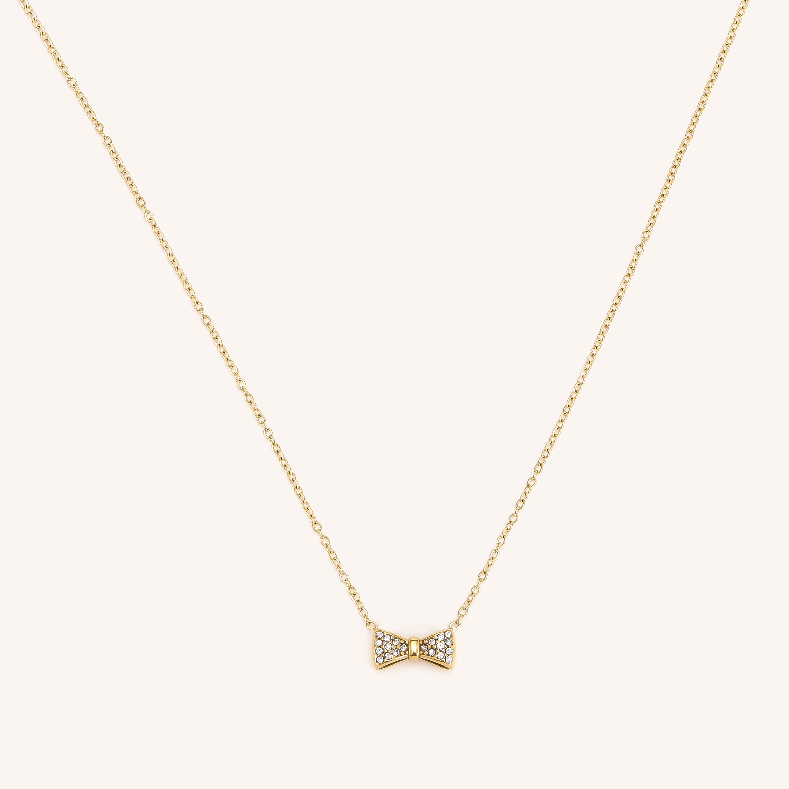 The Dainty Crystal Bow Necklace is a cute accessory that adds a playful sparkle to your look. Its charming bow design brings a sweet, whimsical touch to any outfit!