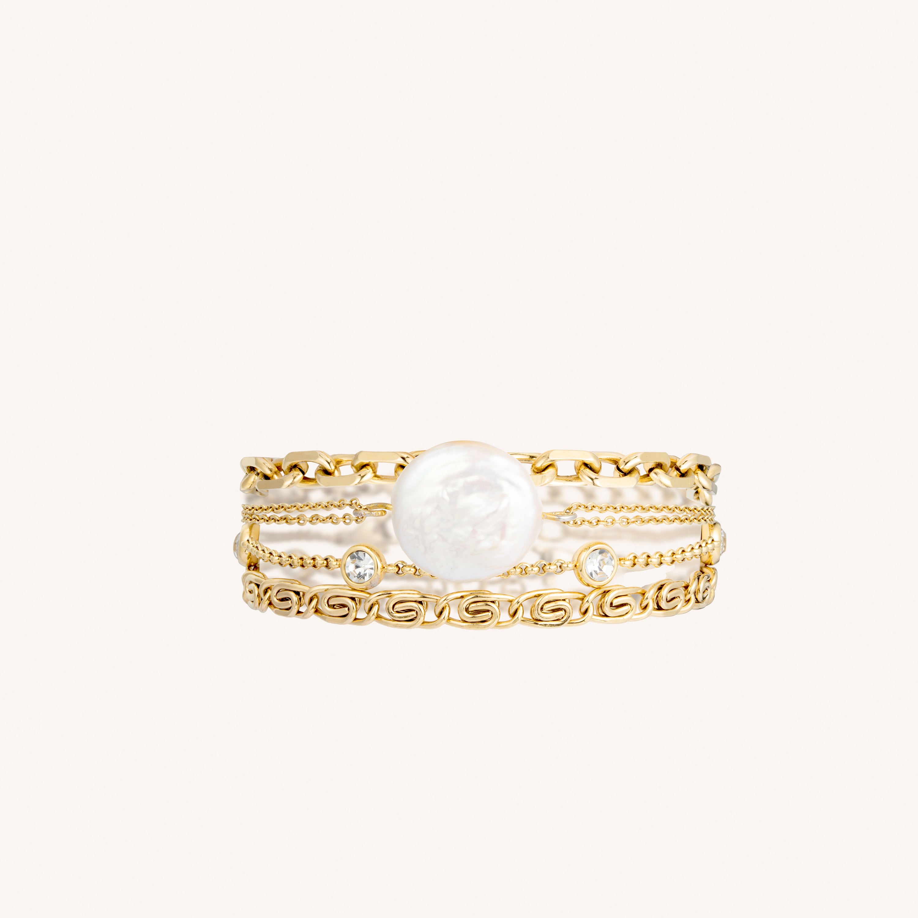 Classy, and full of shine the Haisley Mini Cuff is a stunning piece! This bracelet is made up of dainty gold chains and glass pieces so the natural pearl can really be the star of the show.