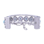 Silver ball chains and pendants are stacked together to create a complete stack. Brooch style pendants set with Turquoise stones give this bracelet a vintage charm.