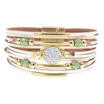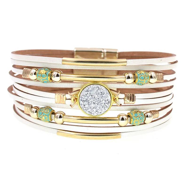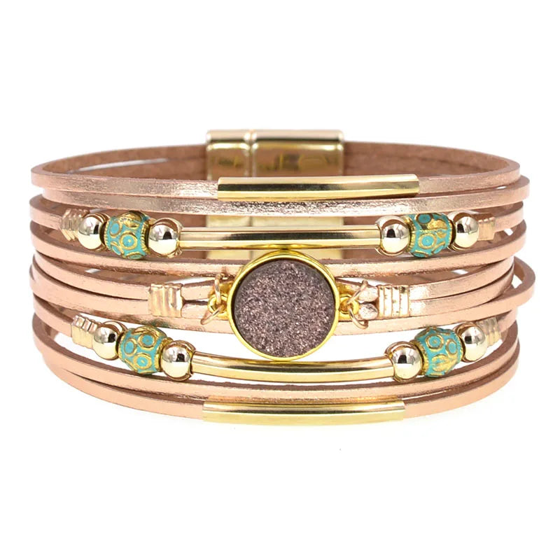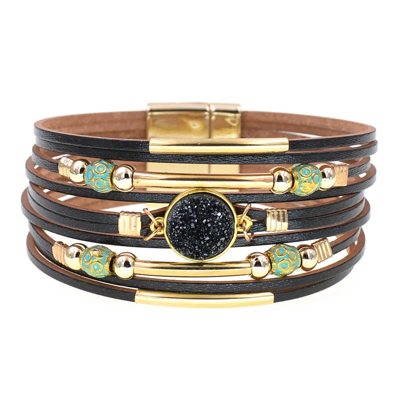 A stylish blend of texture and ease, the Boho Leather Wrap Bracelet adds effortless charm to any stack. Designed with layered leather strands and a sleek magnetic clasp, it wraps comfortably around the wrist for a relaxed yet pulled-together look. Lightweight, durable, and easy to wear, this bracelet transitions beautifully from casual weekends to everyday outfits.