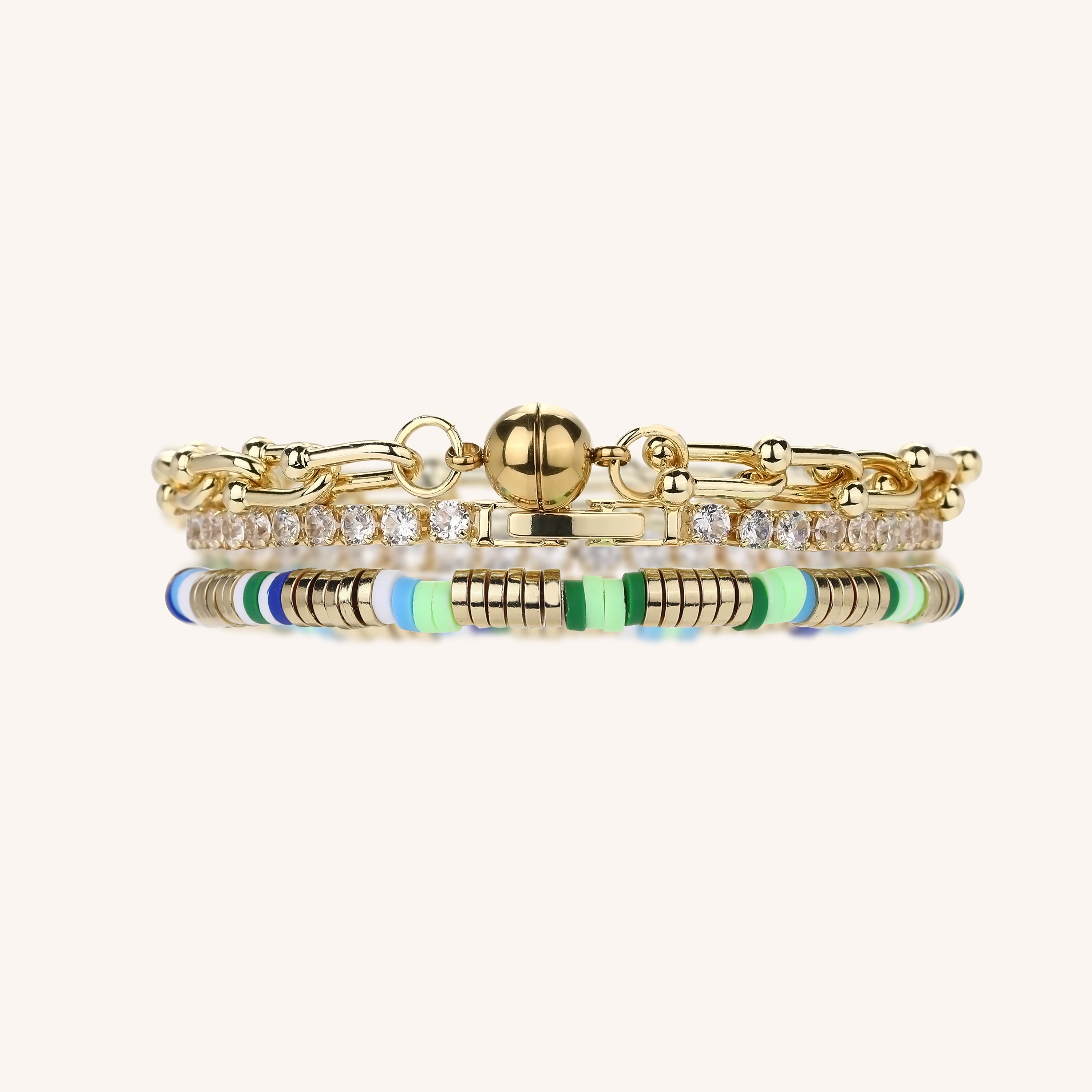 Add a touch of gold, glitz and cool colors to your accessory game with the Laura Stacking Set. With 3 shimmering bracelets that stack beautifully, this set is perfect for any trendy fashionista!