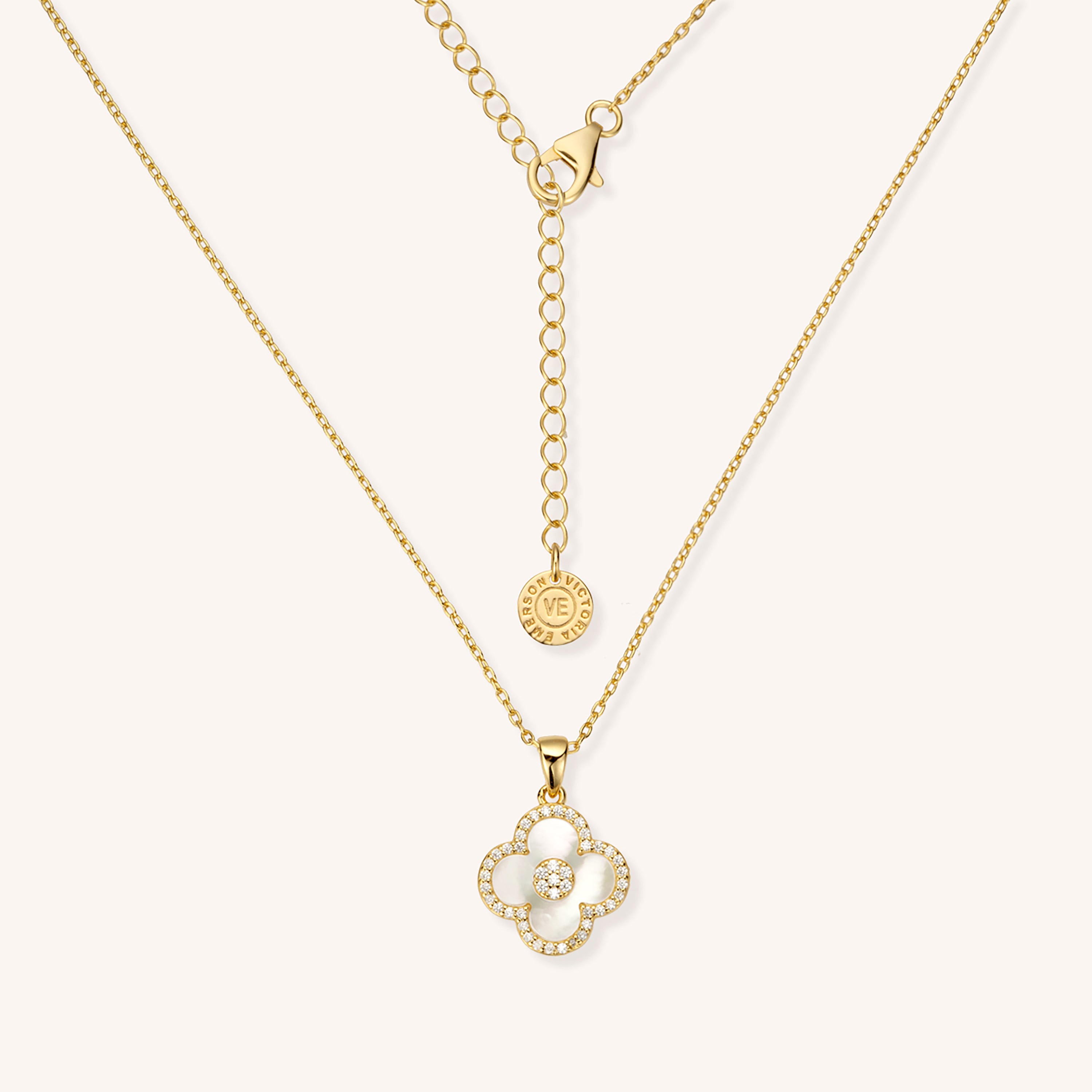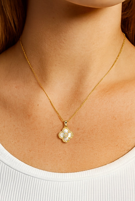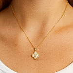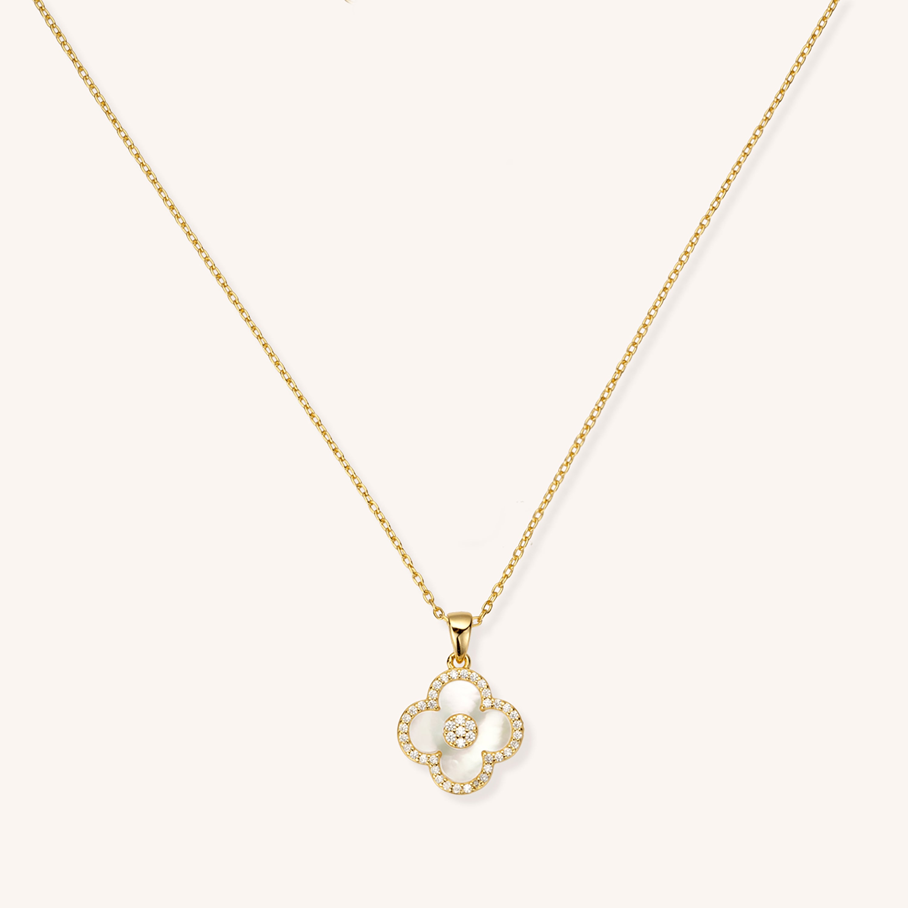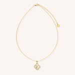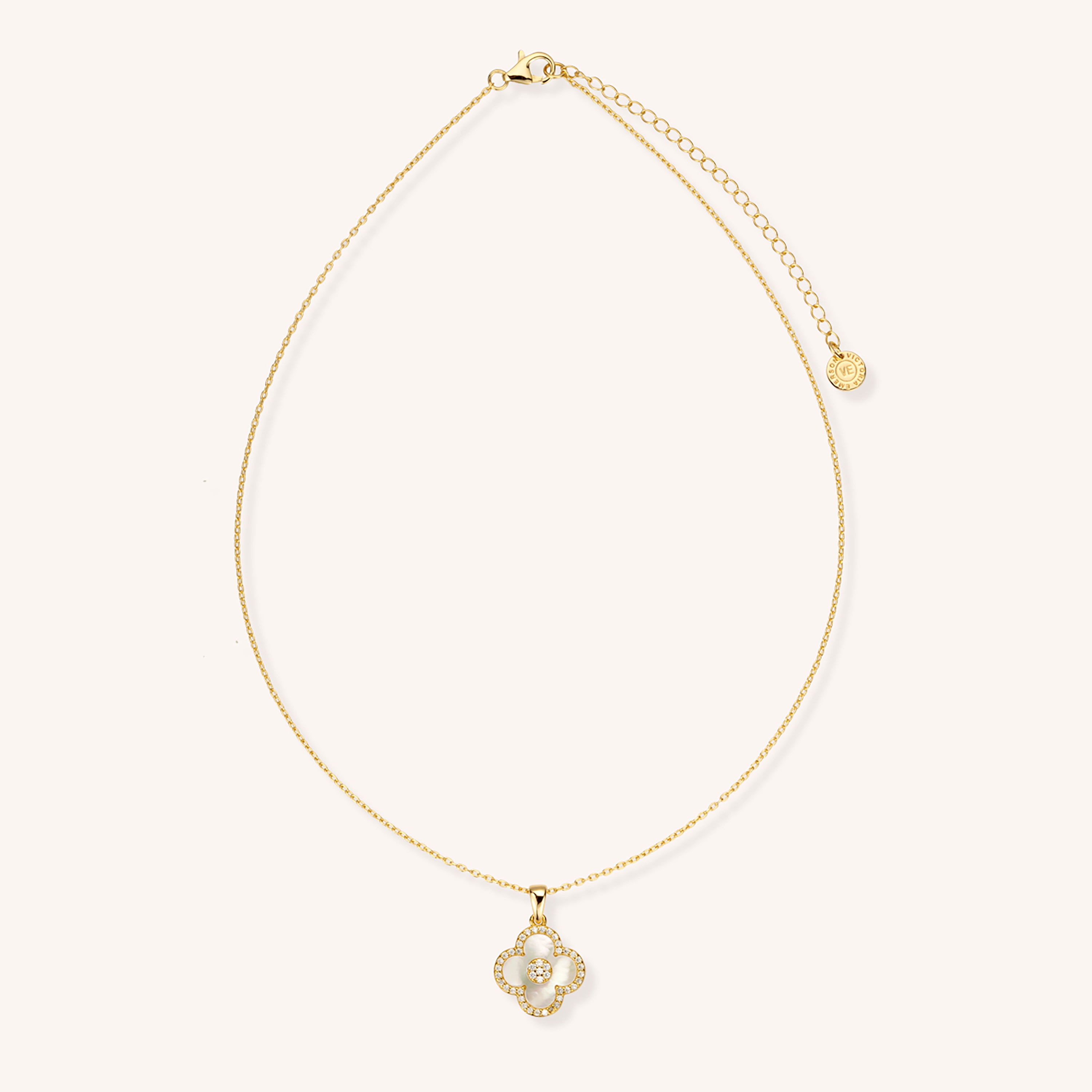A large clover pendant set with pavé micro crystals and made with our long-lasting 18K gold vermeil. Hangs on a dainty cable chain keeping the pendant as the focal point.