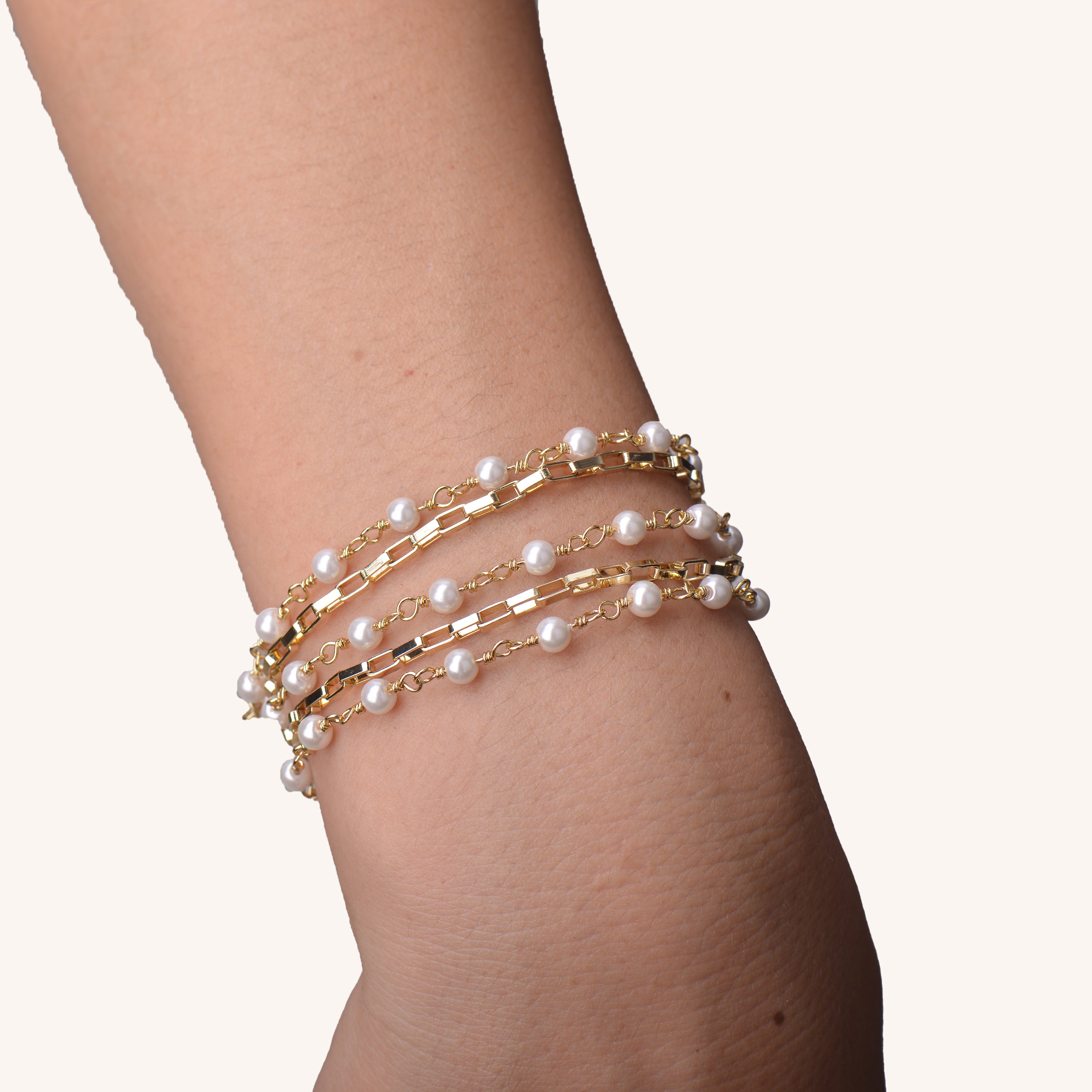 Stacked bracelets but all on one clasp. Trendy ball beads are mixed with pearls to make the perfect pre-layered piece.