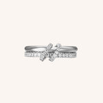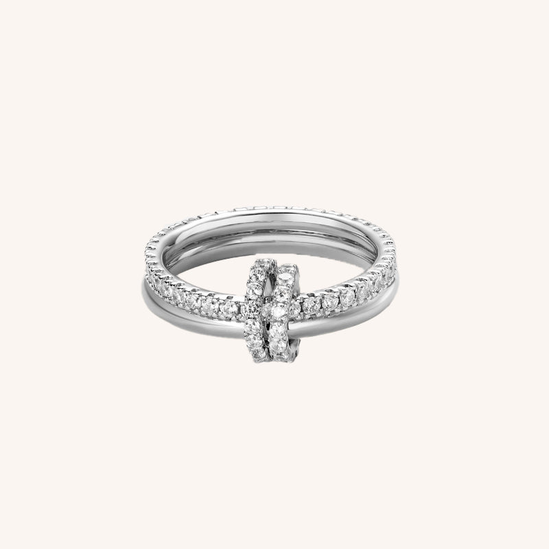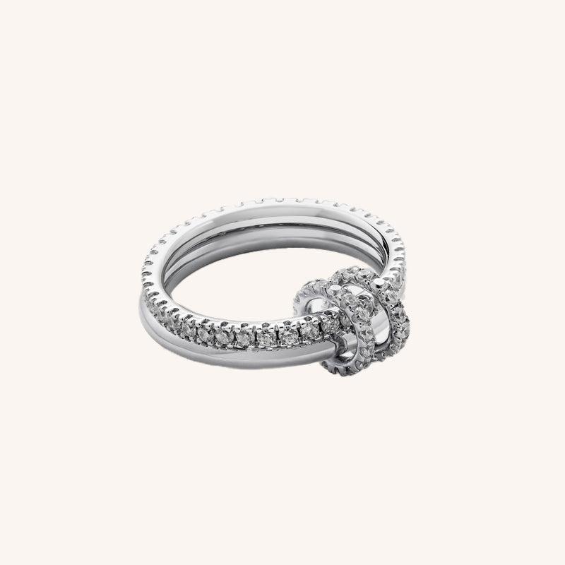Silver eternity band are held together with pave charms that move along both rings. Symbolizing unity, this set is the perfect statement piece or place holder for your wedding or engagement rings. Available in sizes 6-9.
